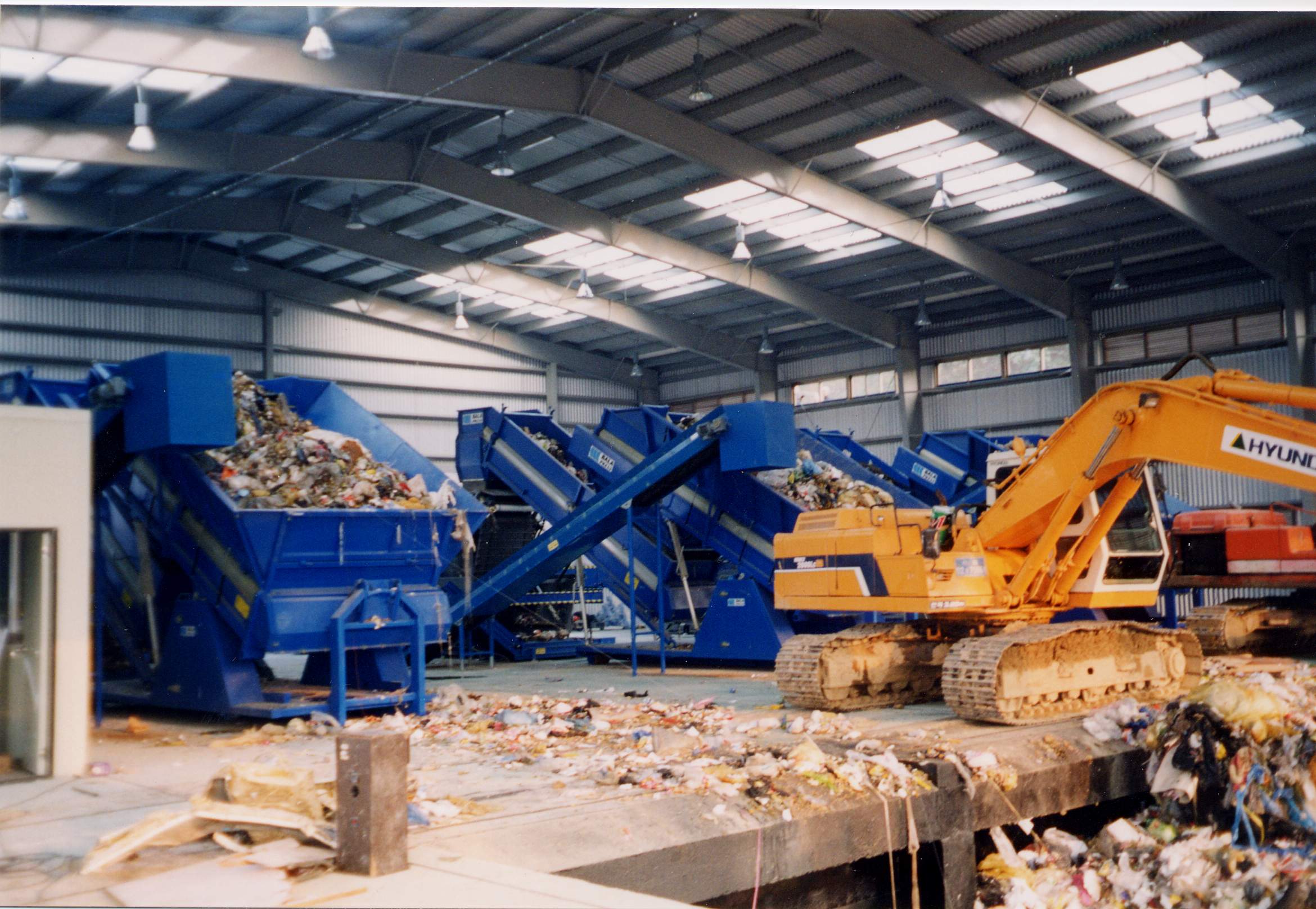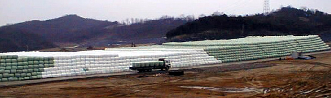 This landfill outside Jeonju City accepts waste from Jeonju and two small towns nearby; a total of 600 bales/day of household waste and organic waste (30%) is delivered to this landfill. During mid-November 2001, three of our machines were commissioned and they operated under roof-cover 10 hours/day, 6 days/week.